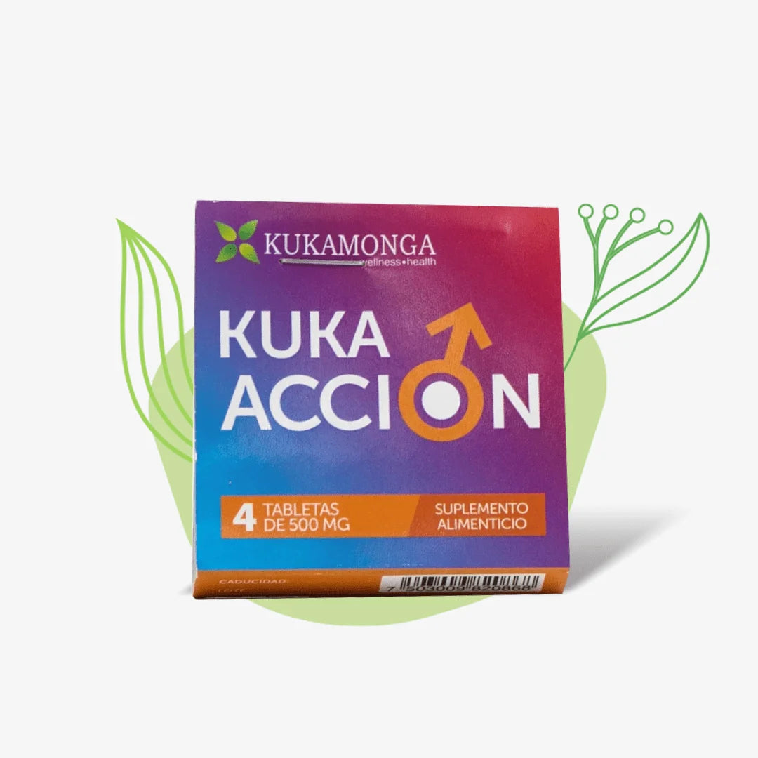 Presentación: Kuka Acción 4 Tabletas de 500 mg \n \nComposición: Maca, avena, complejo B, arginina, vitamina B3 \n \nEL CONSUMO DE ESTE PRODUCTO ES RESPONSABILIDAD DE QUIEN LO RECOMIENDA Y DE QUIEN LO USA \n \nESTE PRODUCTO NO ES UN MEDICAMENTO