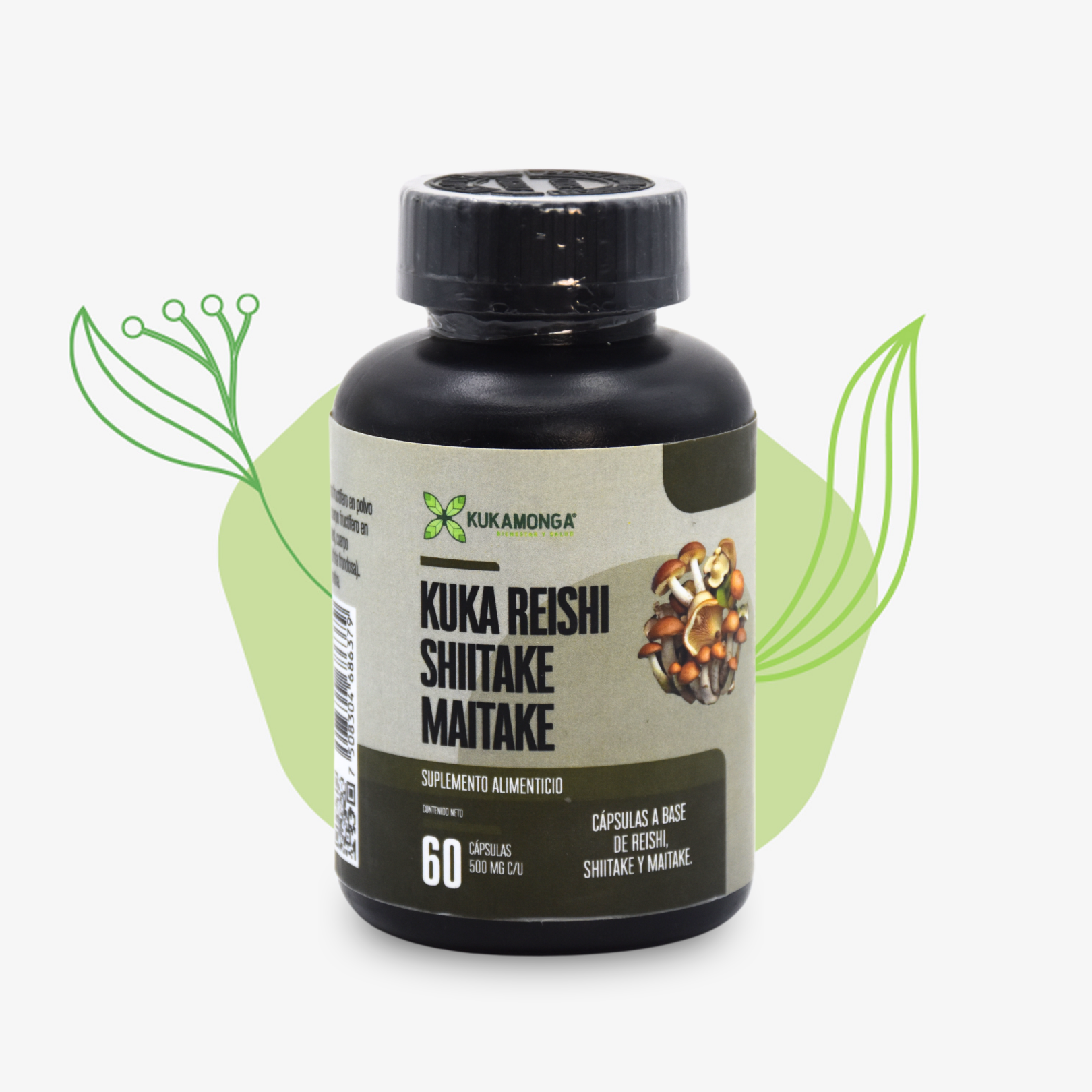 Kuka Reishi Shiitake Maitake de marca KUKAMONGA, contiene 60 cápsulas de 500 mg c/u.