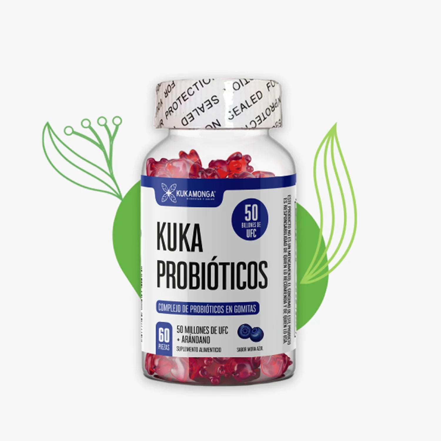 Kuka Probióticos, complejo de probióticos en gomitas, sabor mora azul \n \nPro-Bióticos (50 billones CFU) Bacillus coagulans SNZ 1969, Bacillus Subtilis DE111, Polvo de Arándano (Fruta). \n \nEL CONSUMO DE ESTE PRODUCTO ES RESPONSABILIDAD DE QUIEN LO RECOMIENDA Y DE QUIEN LO USA \n \nESTE PRODUCTO NO ES UN MEDICAMENTO