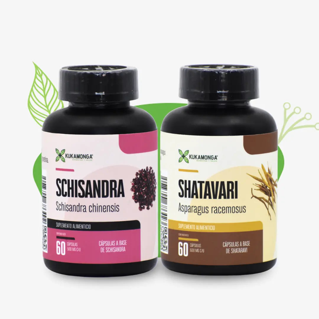 Ese Kit incluye un frasco de Shatavari de marca Kukamonga (60 cápsulas de 600mg) y un frasco de Schisandra de marca Kukamonga (60 cápsulas de 500mg).
