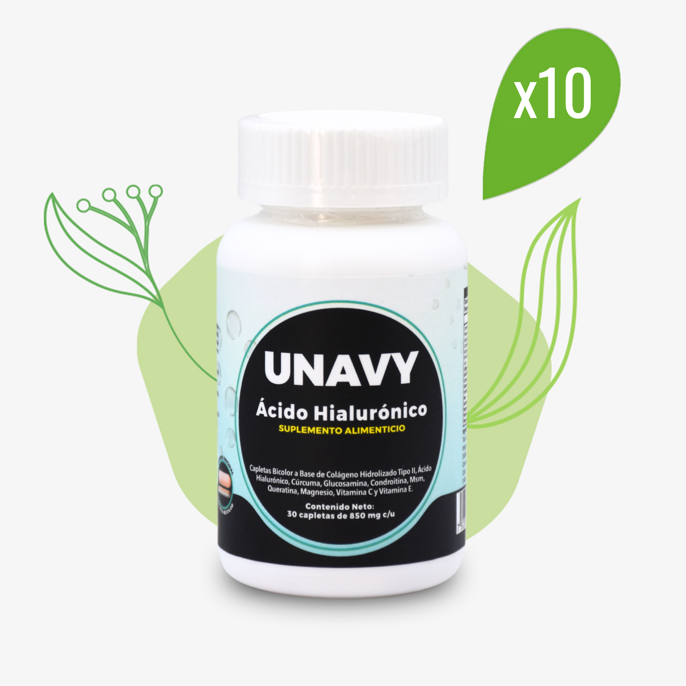 Unavy , contiene 30 capletas de 850 mg c/u.